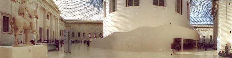 This Is The Great Court at the British Museum. Designed by Norman Foster. | The courtyard has been transformed by adding a space-frame roof, new porticos, shops, and cafes. | The central drum houses a library adds a note of gigantic monuentalism. | Visit the Assyrian,Egyptian, Greek, Attic, Indian, and Chinese galleries. and Hiada totem pole | | ||||||||