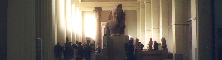 The Egyptian galleries on the ground floor of the British Museum, are particulary atmospheric. | The sculpture in the centre, is of the head of Rameses II 1270 BC from Thebes. | Also in this gallery, the Rosetta stone, a granite sculpture of Sesosteris III, and many other fine works. | From here you can visit the Assyrian, Greek, Attic, Indian, and Chinese galleries | ![]() |