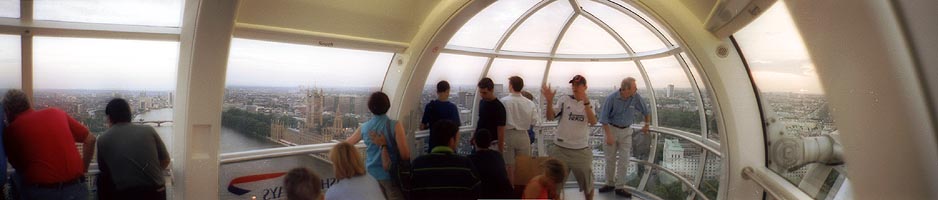 This is the view from a London eye pod . The views are spectacular. Shaped like a bicycle wheel, it takes 40 mins to rotate once. | To the WEST you can see along the river towards Parliament and Westminster. and in the distance, Vauxhall bridge. | Tickets are only booked in advance, Buy tickets online from the London Eye Website . Weekends can be busy. | To the EAST you can see along the river towards the South Bank and Cleopatras Needle. with the City in the distance. | | ||||||||