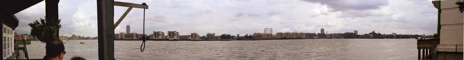 You are standing on the Balcony of the Prospect of Whitby pub looking east towards the Isle of Dogs. | There has been a pub here since 1520. The noose relates to Execution dock just up river. | you are looking west towards tower bridge | ![]() |