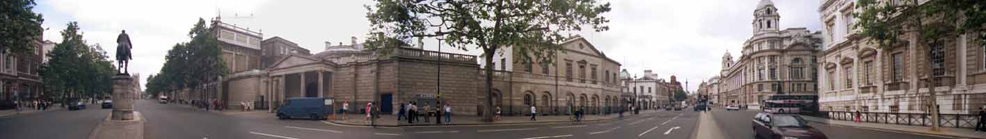you are on WHITEHALL looking SOUTH towards WESTMINSTER..Whitehall is the administrative centre of Britain. | DOWNING ST, home of the British prime minister visit N0 10 website. | SCOTTISH OFFICE | HORSE GUARDS where the trooping of the colour takes place and beyond the old Admiralty buildings. | You are looking NORTH towards Trafalgar square and Nelsons Column | Ministry of AGRICULTURE and The BANQUETING HOUSE with an excellent painted ceiling by Rubens | | ||||||||||||